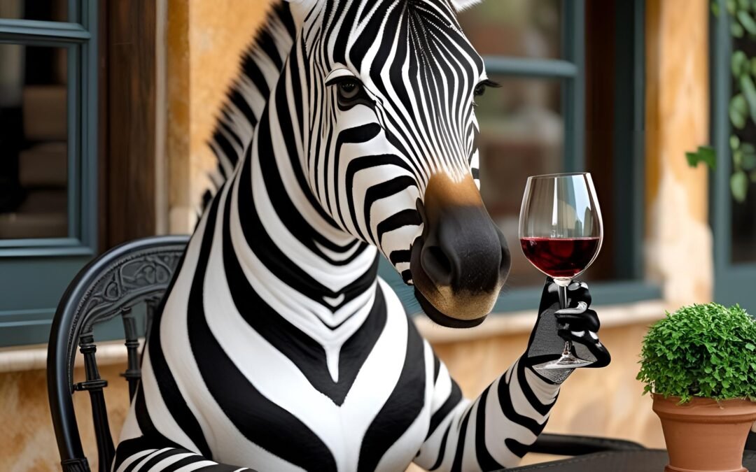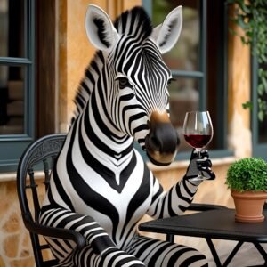 zebra holding a wine glass with wine in it while sitting in a bistro chair – make it realisticJun 12, 2025